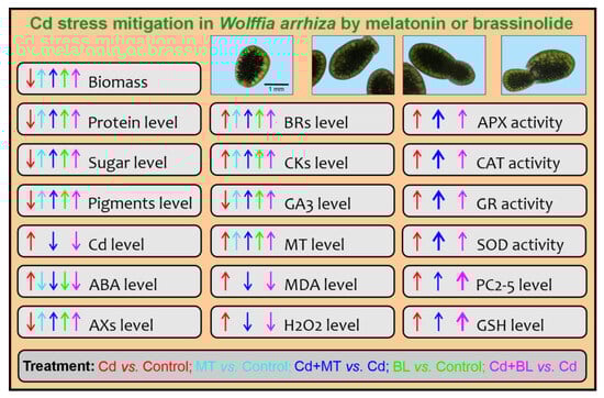 Wolffia arrhiza (L.) Horkel ex Wimm. (Lemnaceae) is the smallest angiosperm, characterized by highly reduced organs and the absence of a root system, stem, and leaves. Flowering occurs rarely, so it usually reproduces vegetatively [,]. Its simplified body structure is an excellent adaptation to aquatic life. W. arrhiza can absorb heavy metals and other xenobiotics from polluted water [,]. Therefore, its ability to accumulate xenobiotics, rapid reproduction, and straightforward cultivation methods make W. arrhiza suitable for research and practical use in water purification [,]. In this study, we compared the effects of Cd and/or MT or BL on W. arrhiza. We hypothesized that: (1) the levels of endogenous phytohormones change when influenced by Cd along with MT or BL; (2) exogenously applied MT and BL can similarly counteract the inhibitory effects of Cd on the growth rate and the concentration of pigments, sugars, and proteins in W. arrhiza; (3) both exogenous MT and BL can boost the activity of ascorbate peroxidase (APX), catalase (CAT), glutathione reductase (GR), and superoxide dismutase (SOD), and enhance the levels of glutathione (GSH) and PCs in plants exposed to Cd; (4) treatment with MT or BL leads to reduced H2O2 and MDA levels in W. arrhiza grown with Cd; and (5) the impact of MT and BL on W. arrhiza subjected to Cd can vary and depends on the analyzed compounds.