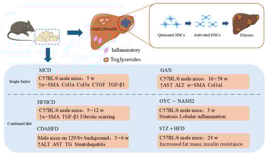 Nonalcoholic fatty liver disease (NAFLD) affects approximately 25% of the global population []. NAFLD manifests as the accumulation of triglycerides (TGs) in the hepatic cytoplasm and encompasses liver diseases such as simple steatosis, nonalcoholic steatohepatitis (NASH), HF, and cirrhosis. NASH, a more severe and progressive form of NAFLD, can present as liver fibrosis or scarring due to inflammation and hepatocyte injury [,]. Currently, simple and cost-effective modeling methods, such as a high-fat diet (HFD), methionine choline-deficient (MCD), and Gubra–Amylin NASH (GAN) diet, are widely used to mimic NAFLD/NASH in mice; these methods involve lipid metabolism, inflammation, oxidative stress, and fibrotic pathways through a lack of energy or hepatic lipid content and alter the expression of proteins to achieve the pathological symptoms of HF. However, it is difficult to achieve the pathological process of fibrosis with a single HFD. Moreover, the improvement in and combination of some dietary induction methods also provide more avenues for the therapeutic exploration of HF related to NASH (Figure 1) [,].