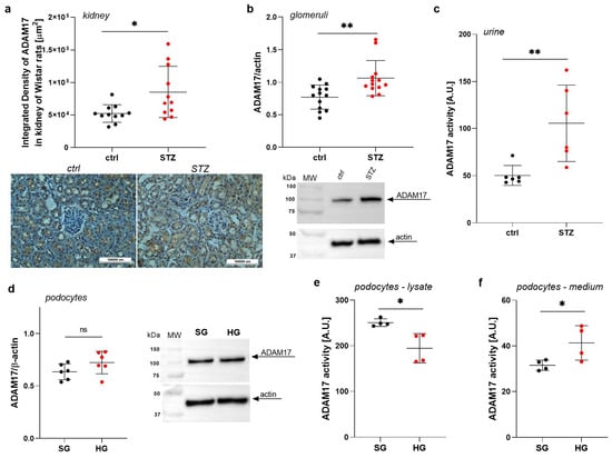 In the present study, we investigated whether ADAM17 may play a role in the pathogenesis of diabetic kidney disease via the induction of glomerular injury. For this purpose, we used rats with diabetes induced by STZ compared with age-matched control healthy rats. We conducted immunohistochemical staining of kidney tissue samples that were obtained from both STZ-treated Wistar rats and control rats. The density of brown staining in the stained tissue sections directly correlated with the amount of ADAM17 protein. There was a significant 56% increase in ADAM17 levels in the renal tissue (p = 0.0154; Figure 1a). We also analyzed lysates that were derived from glomeruli that were isolated from STZ-treated rats to assess the changes in the amount of ADAM17 protein. The isolated glomeruli from STZ-treated rats exhibited a 38% increase in ADAM17 levels (p = 0.0029; Figure 1b). These findings suggest that ADAM17 protein levels are significantly elevated in both renal tissue and isolated glomeruli from STZ-treated rats, implying a potential link between ADAM17 and injury in glomeruli, which is often associated with diabetes.