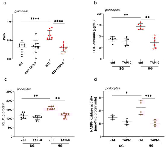 Inhibition of ADAM17 improved albumin permeability in the glomeruli of diabetic rats and across the monolayer of podocytes exposed to high glucose concentrations, with concomitant attenuation of HG-induced oxidative stress in podocytes. (a) ADAM17 inhibition in the presence of TAPI-0 improved glomerular albumin permeability (n = 10). (b) ADAM17 inhibition ameliorated albumin permeability via the monolayer of podocytes (n = 6) that were cultured in the presence of HG concentrations. (c) The elevation of ROS production in podocytes that were exposed to HG was reduced in the presence of TAPI-0 (n = 8). (d) The induction of oxidative stress under HG conditions, manifested by an increase in NADPH oxidase activity, was attenuated by the ADAM17 inhibitor TAPI-0 (n = 4). The results are expressed as the mean ± SD. **** p < 0.0001, *** p < 0.001, ** p < 0.01, * p < 0.05. Ctrl, control; STZ, streptozotocin; SG, standard glucose; HG, high glucose; TAPI-0, ADAM17 inhibitor.