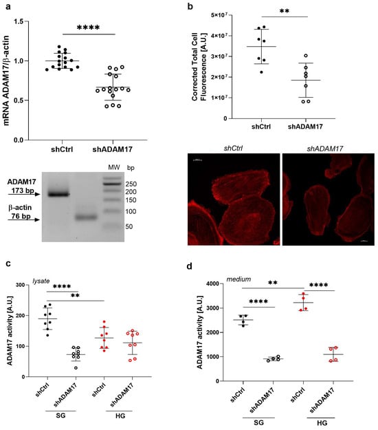 Since TAPI-0 is a non-selective inhibitor of ADAM17 and also inhibits matrix metalloproteinases (MMPs) [27], we transfected podocytes with short-hairpin RNA targeting ADAM17 (shADAM17) to downregulate its expression and investigate whether the effect of high glucose concentrations on the permeability of the podocyte monolayer to albumin depends on ADAM17. A decrease in ADAM17 expression was confirmed through real-time PCR (33% decrease in ADAM17 mRNA levels; p < 0.0001; Figure 3a), and immunofluorescent staining (46% decrease; p = 0.0032; Figure 3b). Additionally, ADAM17 downregulation decreased its activity in both the lysate and medium under SG conditions by 61% (p < 0.0001; Figure 3c) and 64% (p < 0.0001; Figure 3d), respectively. We found that ADAM17 activity in cell lysates from shCtrl cells after exposure to an HG medium decreased by 33% (p = 0.0028; Figure 3c) but increased in the extracellular medium by 28% (p = 0.0041; Figure 3d). ADAM17 downregulation did not further affect ADAM17 activity in lysates from shADAM17 cells compared with the shCtrl under HG conditions (Figure 3c) but significantly decreased ADAM17 activity by 66% in the medium (p < 0.0001; Figure 3d).