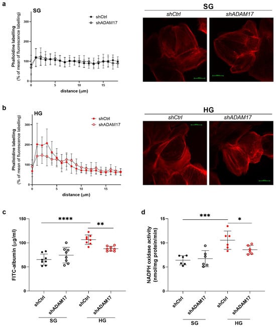 ADAM17 downregulation remodels the actin cytoskeleton in podocytes and improves albumin permeability through the monolayer of podocytes cultured under high glucose conditions. The F-actin network was labeled with isothiocyanate phalloidin and visualized by fluorescence microscopy. Control cells (shCtrl) and cells with the silencing of ADAM17 gene expression (shADAM17) were grown on coverslips and incubated in (a) standard glucose (SG; 11 mM) or (b) high glucose (HG; 30 mM) medium. Scale bar = 25 μm. Digitized fluorescence images of the F-actin network were used to generate fluorescence intensity profiles (from the basal membrane to the nucleus) using NIS-Elements 5.11.02 imaging software (n = 20). (c) Effects of ADAM17 downregulation on albumin permeability through the monolayer that was formed by shCtrl or shADAM17 podocytes that were cultured in an SG or HG environment (n = 8). (d) The high glucose-induced activation of NADPH oxidase was attenuated in shADAM17 podocytes (n = 6). The results are expressed as the mean ± SD. **** p < 0.0001, *** p < 0.001, ** p < 0.01, * p < 0.05. SG, standard glucose; HG, high glucose.