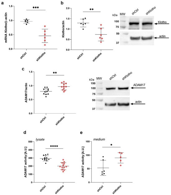 Numerous studies have shown that Klotho deficiency is strongly associated with the pathogenesis of diabetic kidney disease [29]. Our previous study demonstrated that the shedding of soluble Klotho was increased in hyperglycemia and caused a decrease in the amount of podocyte membrane-bound Klotho, affecting podocyte filtration functions [22]. Additionally, our recent study revealed that Klotho deficiency in podocytes induced oxidative stress and increased ADAM10 activity in an extracellular medium with a concomitant increase in albumin permeability through an shKlotho podocyte monolayer [30]. Thus, in the next step of our study, we silenced Klotho gene expression in podocytes by lentiviral transduction of Klotho shRNA and examined the ADAM17 protein levels in shKlotho podocytes, and the ADAM17 activity in both the shKlotho cell lysate and extracellular medium. A decrease in Klotho expression was confirmed through real-time PCR (52% decrease in Klotho mRNA levels; p = 0.0005; Figure 5a), and Western blot (43% decrease in Klotho protein levels; p = 0.0042; Figure 5b). Klotho gene silencing caused a 22% increase in ADAM17 protein levels (p = 0.002; Figure 5c), decreased ADAM17 activity by 32% in the shKlotho podocytes (p < 0.0001; Figure 5d), and significantly increased ADAM17 activity by 70% in the extracellular medium (p = 0.0340; Figure 5e). These findings indicate that the loss of Klotho promotes the shedding of ADAM17 in podocytes and supports the link between Klotho and ADAM17 in the context of podocyte function.