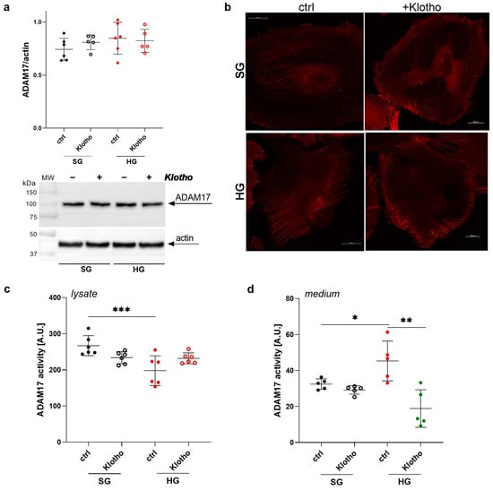 The administration of Klotho has been found to be an effective treatment for kidney injury and the preservation of renal function in early clinical studies [31,32]. Our previous study demonstrated a positive effect on maintaining proper glomerular permeability in diabetic rats and albumin permeability in a podocyte monolayer under hyperglycemic conditions, confirming that Klotho exerts renal protective effects [22]. In this study, we examined whether the deteriorative effects of increased extracellular ADAM17 activity on podocyte function may be reversed by Klotho administration. No significant changes in ADAM17 protein levels were observed in podocytes that were cultured in an SG or HG environment in the presence of Klotho (Figure 6a). However, we detected Klotho-induced changes in the intracellular distribution of ADAM17 protein under both SG and HG conditions. In the presence of Klotho, ADAM17 protein was located closer to the cell membrane and appeared as scattered granules, especially in cells that were cultured in the HG environment (Figure 6b).