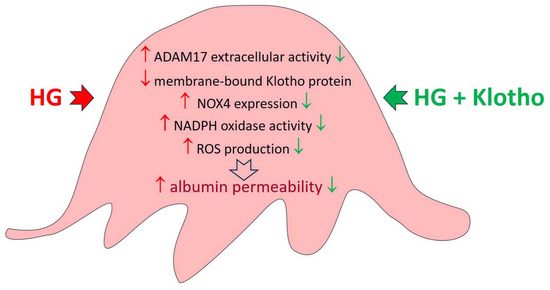 Accumulating evidence confirms that high glucose (HG) concentrations affect podocyte metabolism and function [17]. Oxidative stress plays a critical role in the initiation and progression of DKD. It results from the overproduction of reactive oxygen species (ROS) with the concomitant insufficient activity of antioxidant pathways. Our earlier study found that the exposure of podocytes to HG concentrations caused oxidative stress, reflected by an increase in ROS production and NADPH oxidase activity, with an important role of the NADPH oxidase 4 (NOX4) subunit in ROS elevation and regulation of antioxidant enzymes in these cells [18]. NADPH oxidase is the main source of ROS in podocytes cultured in an HG milieu [18]. NOX4 is expressed at relatively high levels in the kidney. In the context of DKD, NOX4 is one of the most extensively studied isoforms of NADPH oxidase subunits, which is often upregulated [19]. We also found that HG attenuated the insulin responsiveness of podocytes [20] and increased permeability to albumin via the podocyte monolayer in vitro [21]. Our recent study demonstrated that Klotho levels increased in serum and decreased in renal tissue, glomeruli, and urine in diabetic rats. The increased shedding of Klotho under hyperglycemic conditions caused a decrease in the amount of podocyte membrane-bound Klotho. Moreover, the addition of Klotho impacted glucose metabolism in podocytes and albumin permeability of the glomerular filtration barrier under HG conditions [22].