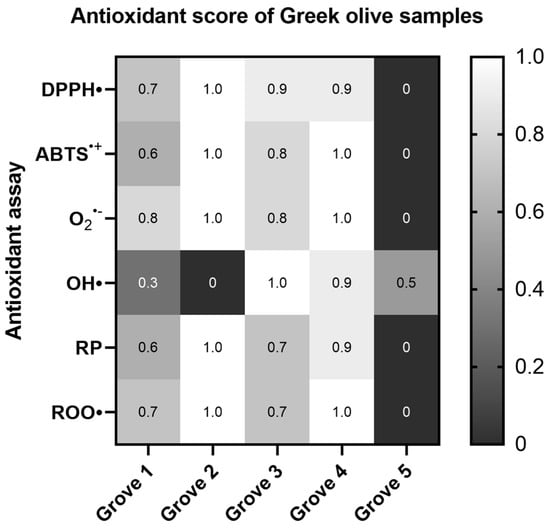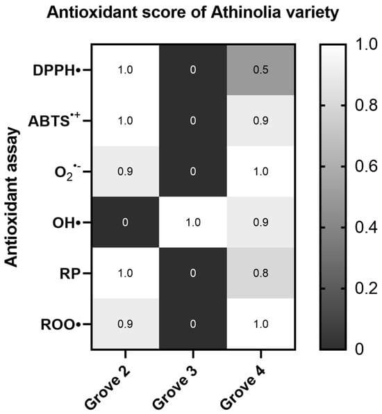Heat map of the antioxidant score, corresponding to the antioxidant potential of Athinolia samples for the assays DPPH•, ABTS•+, Superoxide radical (O2•−), Hydroxyl radical (OH•), Reducing power (RP), and Peroxyl radical (ROO•)-induced plasmid DNA relaxation assay. (Grove 2: rainfed, 630 m, Grove 3: rainfed, 270 m, Grove 4: irrigated, 270 m). The color scale from gray to white represents the Antioxidant score values of the normalized antioxidant capacity data, from low to high, respectively, with 0 representing the lowest antioxidant score and 1 the highest.