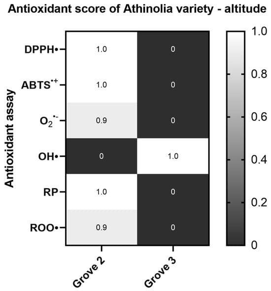Heat map of the antioxidant score, corresponding to the antioxidant potential of Athinolia samples for the assays DPPH•, ABTS•+, Superoxide radical (O2•−), Hydroxyl radical (OH•), Reducing power (RP), and Peroxyl radical (ROO•)-induced plasmid DNA relaxation assay, with respect to the altitude (Grove 2: 630 m, Grove 3: 270 m). The color scale from gray to white represents the Antioxidant score values of the normalized antioxidant capacity data, from low to high, respectively, with 0 representing the lowest antioxidant score and 1 the highest.