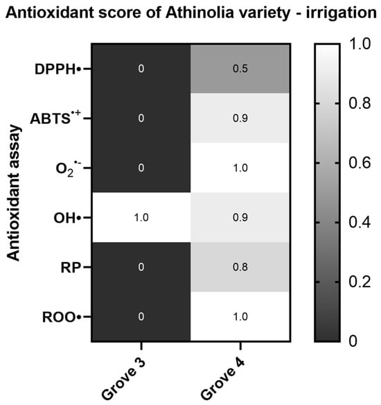 Heat map of the antioxidant score, corresponding to the antioxidant potential of Athinolia samples for the assays DPPH•, ABTS•+, Superoxide radical (O2•−), Hydroxyl radical (OH•), Reducing power (RP), and Peroxyl radical (ROO•)-induced plasmid DNA relaxation assay, with respect to the irrigation regime (Grove 3: rainfed, Grove 4: irrigated). The color scale from gray to white represents the Antioxidant score values of the normalized antioxidant capacity data, from low to high, respectively, with 0 representing the lowest antioxidant score and 1 the highest.
