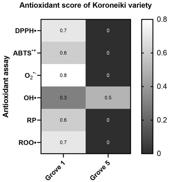 Heat map of the antioxidant score, corresponding to the antioxidant potential of Koroneiki samples for the assays DPPH•, ABTS•+, Superoxide radical (O2•−), Hydroxyl radical (OH•), Reducing power (RP), and Peroxyl radical (ROO•)-induced plasmid DNA relaxation assay (Grove 1: rainfed, 580 m, Grove 5: irrigated, 152 m). The color scale from gray to white represents the Antioxidant score values of the normalized antioxidant capacity data, from low to high, respectively, with 0 representing the lowest antioxidant score and 1 the highest.