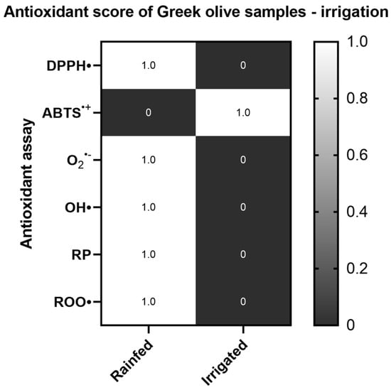 Heat map of the antioxidant score, corresponding to the antioxidant potential of Greek olive samples for the assays DPPH•, ABTS•+, Superoxide radical (O2•−), Hydroxyl radical (OH•), Reducing power (RP), and Peroxyl radical (ROO•)-induced plasmid DNA relaxation assay, with respect to different irrigation regimes. The color scale from grey to white represents the Antioxidant score values of the normalized antioxidant capacity data, from low to high, respectively, with 0 representing the lowest antioxidant score and 1 the highest.