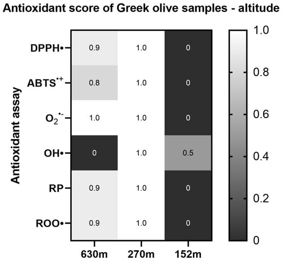 Heat map of the antioxidant score, corresponding to the antioxidant potential of Greek olive samples for the assays DPPH•, ABTS•+, Superoxide radical (O2•−), Hydroxyl radical (OH•), Reducing power (RP), and Peroxyl radical (ROO•)-induced plasmid DNA relaxation assay, with respect to the altitude. The color scale from gray to white represents the Antioxidant score values of the normalized antioxidant capacity data, from low to high, respectively, with 0 representing the lowest antioxidant score and 1 the highest.
