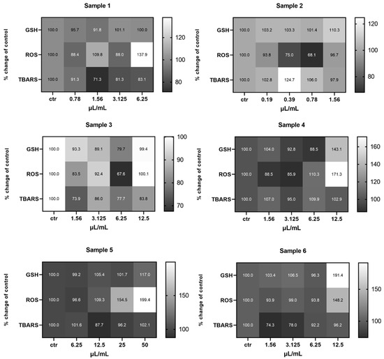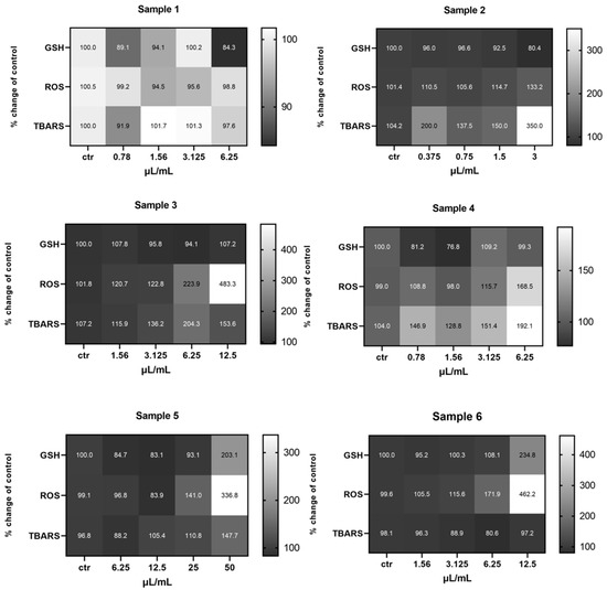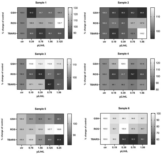 With respect to the MKN45 cell line, data analysis demonstrated differences in the levels of the examined redox biomarkers on each sample. More precisely, the GSH levels of the cells treated with Sample 5 (irrigated, Koroneiki, 152 m) varied significantly, with decreased levels observed at 6.25 and 15.5 μL/mL and increased levels at 50 μL/mL. The cells treated with Sample 4 (irrigated, Athinolia, 270 m) had decreased levels of GSH at 0.78 and 1.56 μL/mL, and increased levels at 3.125 μL/mL, whereas the results for the cells treated with Sample 2 (arid, Athinolia, 630 m) and for the cells treated with the mixture Sample 6 showed a decrease at 3 μL/mL and an increase at 12.5 μL/mL, respectively. Regarding the ROS levels, in most cases an increase was observed in the treated cells. Specifically, the cells treated with Sample 3 (arid, Athinolia, 270 m) exhibited increased levels of ROS in all the test concentrations. Elevated levels of ROS were also observed in cells treated with Sample 4 at 6.25 μL/mL, in cells treated with Sample 5 at 25 and 50 μL/mL, as well as in cells treated with the mixture Sample 6, at 3.125 and 6.25 μL/mL. Finally, the TBARS levels showed variations, with decreased levels found in cells treated with Sample 1 (arid, Koroneiki, 580 m) at 0.78 μL/mL. Increased levels of TBARS were found in cells treated with Sample 2 at 3 μL/mL, in cells treated with Sample 4 at 0.78 and 3.125 μL/mL, and in cells treated with Sample 5 at 50 μL/mL (Tables S20–S25) (Figure 10).