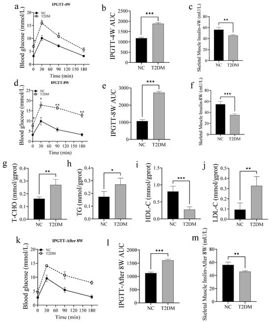High-glucose treatment resulted in the generation of a zebrafish model of type 2 diabetes mellitus (T2DM). (a) Intraperitoneal glucose tolerance test (IPGTT) curve for zebrafish after 4 weeks of high-glucose treatment (0.5 mg/g body weight (BW)); (b) area under the glucose tolerance curve after 4 weeks of high-glucose treatment; (c) insulin content in skeletal muscle after 4 weeks of high-glucose treatment; (d) IPGTT curve for zebrafish after 8 weeks of high-glucose treatment; (e) area under the glucose tolerance curve after 8 weeks of high-glucose treatment; and (f) insulin content in skeletal muscle after 8 weeks of high-glucose treatment. (g) Total cholesterol (T-CHO); (h) triglyceride (TG); (i) high-density lipoprotein-cholesterol (HDL-C); and (j) low-density lipoprotein-cholesterol (LDL-C). (k) IPGTT curve for zebrafish after normal breeding for 8 weeks following high-glucose intervention for 8 weeks; (l) area under the glucose tolerance curve for zebrafish after normal breeding for 8 weeks following high-glucose intervention for 8 weeks; and (m) insulin content in skeletal muscle of zebrafish after normal breeding for 8 weeks following high-glucose intervention for 8 weeks. * p < 0.05, ** p < 0.01, *** p < 0.001. (n = 6 samples/group).