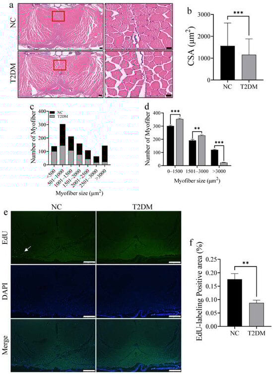 To determine the effect of T2DM on skeletal muscle mass, we performed hematoxylin and eosin (HE) staining of the tail muscles and measured muscle fiber sizes in zebrafish in the two groups. T2DM induced skeletal muscle atrophy in zebrafish, as evidenced by a significant decrease in the overall cross-sectional area of muscle fibers, a significant increase in the cross-sectional area of small (<1500 μm2) muscle fibers, and a significant decrease in the cross-sectional area of large (>3000 μm2) muscle fibers (Figure 2a–d). To examine muscle cell proliferation, the fish were injected with an appropriate amount of 5-Ethynyl-2′-deoxyuridine (EdU, a thymidine analogue that is commonly used to label proliferating cells) via the abdominal cavity. Notably, there was a significant decrease in the EdU stained area in the skeletal muscle of zebrafish with T2DM (Figure 2e,f). Collectively, these results indicate that T2DM suppresses skeletal muscle regeneration in zebrafish.