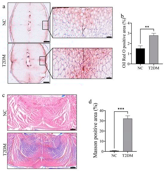 Lipid accumulation and fibrosis were significantly enhanced in the skeletal muscle of zebrafish with type 2 diabetes mellitus (T2DM). (a) Oil red O staining of skeletal muscle after 8 weeks of high-glucose treatment, with red indicating fat-positive staining. The image on the left is a low-magnification image (scale bar: 500 μm); the picture on the right is an enlarged view of the slow-twitch muscle area (scale bar: 50 μm). (b) Positive area of Oil red O staining; (c) Masson staining intensity in the skeletal muscle (scale bar: 200 μm); and (d) statistical chart of Masson staining positive area. ** p < 0.01, *** p < 0.001. (n = 3 samples/group).