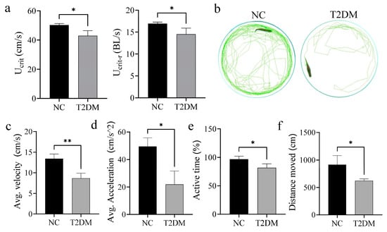 Type 2 diabetes mellitus (T2DM) impairs the motor ability of zebrafish. (a) T2DM significantly reduced the critical swimming speed (Ucrit) and relative critical swimming speed (Ucrit-r, Ucrit/body length (BL)) of zebrafish. (b) Image of zebrafish open-field experiment; (c) average speed of zebrafish open-field experiment; (d) average acceleration of zebrafish in the open-field experiment; (e) proportion of active time in the open-field experiment; and (f) total movement distance of zebrafish in the open field experiment. * p < 0.05, ** p < 0.01. (n = 6 samples/group).