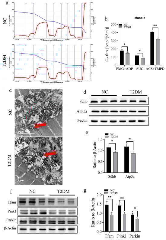 Type 2 diabetes mellitus (T2DM) causes mitochondrial dysfunction in the skeletal muscle of zebrafish. (a) Mitochondrial respiration test chart. The blue curve represents the oxygen content, while the red curve represents the curve of oxygen consumption change. (b) T2DM significantly reduces the respiratory capacity of skeletal muscle mitochondria, where PMG+ADP is the activity of complex I, SUC is the activity of complex II, and ACS+TMPD is the activity of complex IV. (c) Transmission electron microscope image of zebrafish mitochondria; T2DM induces the loss of intramitochondrial cristae (red arrow), scale bar: 2 μm. (d,e) T2DM downregulates the expression of key proteins of the mitochondrial respiratory chain complex in the skeletal muscle of zebrafish (Sdhb and Atp5a). (f,g) T2DM downregulates the expression of key proteins in muscle mitochondrial quality control (Tfam, Pink1, and Parkin). * p < 0.05, ** p < 0.01. (n = 3 samples/group).