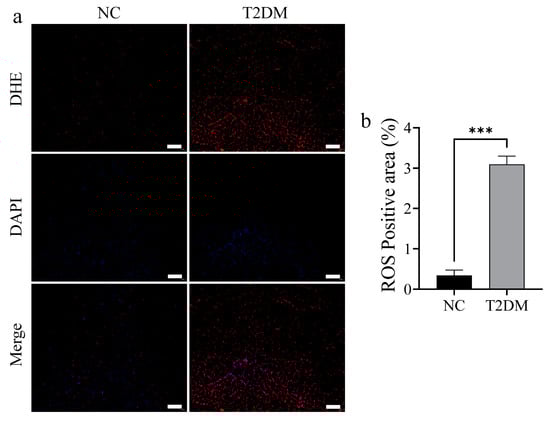 Type 2 diabetes mellitus (T2DM) induces inflammatory response in skeletal muscle. (a) Dihydroethidium (DHE) staining of zebrafish skeletal muscle, scale bar: 100 μm. (b) T2DM increases the accumulation of reactive oxygen species in the skeletal muscle. *** p < 0.001. (n = 3 samples/group).