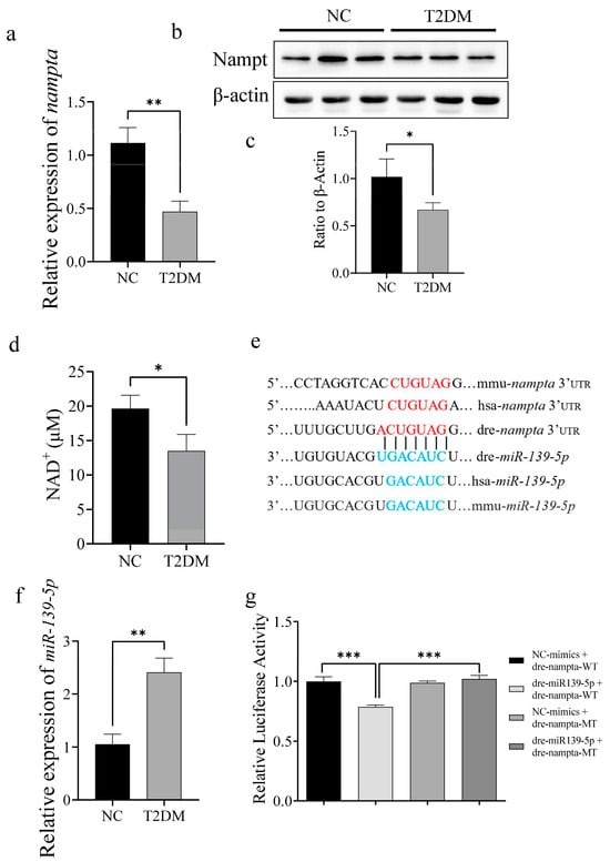 Type 2 diabetes mellitus (T2DM) inhibits NAMPT expression by upregulating miR-139a-5p. (a–c) T2DM significantly downregulates NAMPT mRNA and protein expression in the skeletal muscle of zebrafish. (d) T2DM significantly decreased NAD+ content in the skeletal muscle of zebrafish. (e) Using bioinformatics, we predicted that NAMPT is the target gene of miR-139a-5p; the red part is the seed region of NAMPT, and the blue part is the binding site between miR-139a-5p and the NAMPT seed region. (f) T2DM significantly upregulates miR-139a-5p in skeletal muscle. (g) The dual-luciferase reporter assay showed a regulatory relationship between miR-139a-5p and NAMPT. * p < 0.05, ** p < 0.01, *** p < 0.001. (n = 3 samples per group).