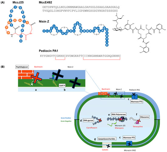 (A) Bacteriocins used in this study. MccJ25 is a 21 aa lasso peptide containing an N-terminal macrolactame ring (in orange) inside which the C-terminal tail of the peptide (in blue) is threaded, sterically blocked by residues Phe19 and Tyr20 located on each side of the ring. MccE92 is a 84 aa siderophore peptide where the C-terminal Ser residue is connected to three N-(2,3-dihydroxybenzoyl) units through a β-d-glucose moiety. Nisin Z is a 24 aa lanthipeptide containing (methyl)lanthionine rings resulting from thioether bridges established between dehydrated Ser/Thr residue and Cys residues. Pediocin PA-1 is a 44 aa linear peptide containing two disulfide bridges (in red). (B) Main targets of the antibiotics and bacteriocins used in this study. Bacitracin is a non-ribosomal cyclic polypeptide that inhibits peptidoglycan synthesis (a) by inhibiting dephosphorylation and hence the recycling of undecaprenyl pyrophosphate. It is effective (bactericidal) mainly against Gram-positive bacteria [52]. Nisin Z interacts with lipid II (b), blocking peptidoglycan biosynthesis, and forms pores in Gram-positive bacteria [53,54]. Pediocin PA-1 binds to mannose phosphotransferase (c), inducing pore formation in Gram-positive bacteria [55]. Ciprofloxacin (a bactericidal fluoroquinolone) disrupts DNA replication by targeting DNA gyrase (d) and topoisomerase IV in most Gram-negative bacteria and some Gram-positive bacteria [56]. Rifampicin is a rifamycin derivative that inhibits RNA polymerase (e) in Gram-positive and Gram-negative bacteria [57]. Tetracycline has a bacteriostatic effect against a wide range of Gram-positive and Gram-negative bacteria by binding to the 30S ribosomal subunit (f) to block protein synthesis [58]. Colistin, a polymyxin antibiotic, binds to lipopolysaccharides (g) in Gram-negative outer membranes, increasing permeability [59]. Microcin J25, its uptake mediated by FhuA, TonB, ExbD, ExbB, and SbmA, inhibits RNA polymerase [60]. MccE492, translocated though a Trojan horse strategy, is recognized by the outer membrane catecholate receptors FepA, Fiu, and/or Cir and interacts with ManYZ, the inner membrane component of the mannose permease (c), causing membrane depolarization and permeabilization [51,61].