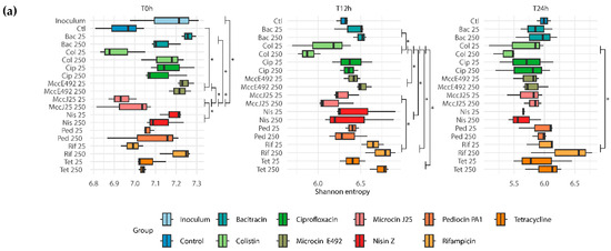 The changes in the microbial community composition over time were examined by sequencing the 16S rRNA gene and measuring alpha diversity as Shannon entropy (Figure 2a). The alpha diversity decreased with time, with an average Shannon entropy of 7.1 at t0, 6.4 at t = 12 h, and 5.8 at t = 24 h (p < 2 × 10−16). At t0, treatments with MccE492 and nisin revealed the highest diversity as compared to control. After 12 h, the treatment with colistin revealed a lower alpha diversity as compared to bacitracin, rifampicin, tetracycline, and the bacteriocins MccE492 and nisin. After 24 h, treatment with colistin induced the lowest alpha diversity, significantly different to treatment with rifampicin. The principal coordinate analysis (PCoA) of the weighted Unifrac dissimilarity matrix obtained using all samples (beta diversity; Figure 2b) revealed that nisin Z and rifampicin treatments tended to cluster separately at 24 h of fermentation.