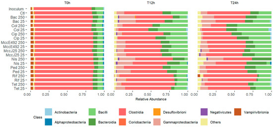 Bacterial diversity of chicken cecum microbiota in culture, determined by Illumina MiSeq-based high-throughput sequencing, in response to the presence of bacitracin (Bac), colistin (Col), ciprofloxacin (Cip), microcin E492 (MccE492), microcin J25 (MccJ25), nisin Z (Nis), pediocin PA-1 (M31L)(Ped), tetracycline (Tet), and rifampicin (Rif). The relative abundance is represented at the class level and the data are grouped into the three time points (0 h, 12 h, and 24 h).