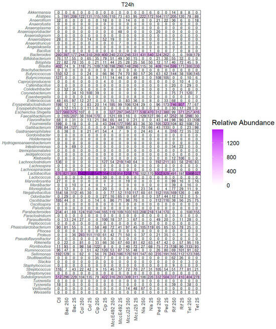 Diversity of bacterial genera in chicken cecal microbiota at 24 h of culture. The relative abundance is represented on a numerical scale and a color intensity scale. Values are the average of three biological replicates for each fermentation. All ASV sequences shared in all treatments are represented. Bacitracin (Bac), colistin (Col), ciprofloxacin (Cip), microcin E492 (MccE492), microcin J25 (MccJ25), nisin Z (Nis), pediocin PA-1 (M31L) (Ped), tetracycline (Tet), and rifampicin (Rif).