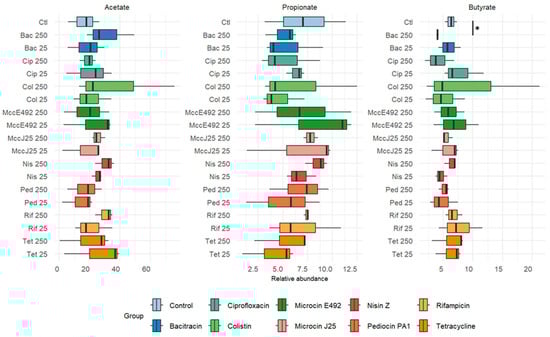 Relative abundance of short-chain fatty acids in chicken cecum microbiota cultured in penicillin bottles for 24 h. Control (Ctl), Bacitracin (Bac), colistin (Col), ciprofloxacin (Cip), microcin E492 (Mcc E492), microcin J25 (MccJ25), nisin Z (Nis), and pediocin PA-1 (M31L) (Ped). Kruskal–Wallis pairwise test (*): p < 0.05.