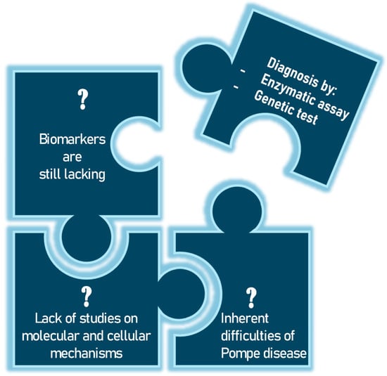 Pompe disease (PD), also known as glycogenosis type II, is a rare inherited metabolic disorder caused by a deficiency of the enzyme acid alpha-glucosidase (GAA enzyme) [1]. This enzyme is essential for the degradation of glycogen in lysosomes, and its deficiency leads to an accumulation in these cellular structures, particularly in skeletal muscle, smooth muscle, the heart and, to a lesser extent, the central nervous system [2,3]. A cascade of pathological events ensues, including the disruption of cellular homeostasis, activation of inflammatory pathways and cell apoptosis (programmed cell death). Depending on the severity of the enzyme deficiency, which in turn depends on the type of mutation in the GAA gene, the clinical manifestations of PD vary widely. The classic infantile form of PD (IOPD) is the most severe and manifests in the first few months of life. Affected infants present with severe hypertrophic cardiomyopathy, generalized muscle hypotonia, respiratory distress and delayed motor development [4]. If left untreated, this form is usually fatal within the first year of life due to cardiac or respiratory failure. Late-onset forms (LOPD) include those that begin in childhood from the age of two, in adolescence or in adulthood. Patients with these forms have progressive muscle weakness, particularly in the shoulder and pelvic girdle muscles, which can lead to difficulty walking and respiratory failure. Cardiomyopathy is less common in the late forms, but may be present in some cases [5]. These symptomatic manifestations are a wake-up call for the clinician, who initiates an investigation to diagnose the disease. Biochemical tests are performed on a suspect sample and, if this shows reduced or absent enzyme activity, genetic tests specific to the GAA gene are performed. The biochemical test can be performed on different types of samples, including dried blood on filter paper (DBS), which allows non-invasive initial screening, particularly useful in newborn babies, while the Sanger sequencing method is the method of choice for studying the GAA gene located on chromosome 17 [6]. But, given the rarity of the disease, numerous questions remain to be answered (Figure 1).