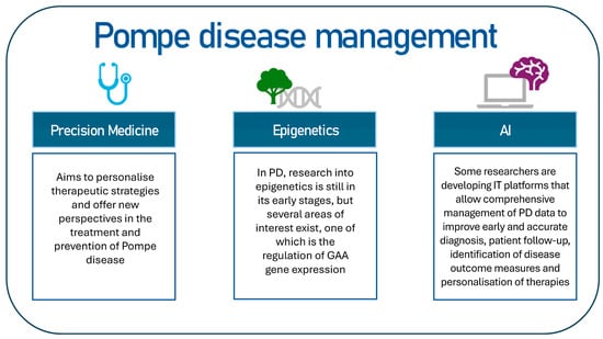 The objective of this review is to identify potential key topics for the management of Pompe disease (Figure 2). This review will examine investigative perspectives, including precision medicine and the potential of artificial intelligence in the context of PD.