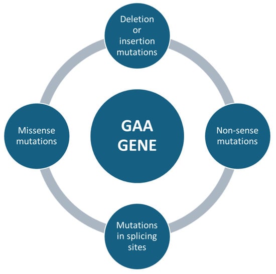 Mutations affecting the GAA gene can be of different types, e.g., missense mutations, which are single nucleotide changes that result in the substitution of an amino acid in the protein sequence (Figure 3). Depending on the severity of the mutation, it can lead to a partial loss of enzyme activity (in late forms of the disease) or almost a complete loss of the enzyme (in severe childhood forms) [43]. Non-sense mutations, in which genetic changes introduce a premature stop codon, result in the production of a truncated non-functional protein (Figure 3). These mutations are usually associated with the severe infantile form, as the resulting protein is completely inactive [44]. Deletion or insertion mutations can occur, resulting in the loss or addition of nucleotides, altering the reading of the genetic code (frameshift) and producing non-functional proteins. For example, a mutation of c.525delT results in a complete loss of function of the enzyme [45]. Mutations in splicing sites, where some variants can affect DNA sequences that regulate the way messenger RNA is processed, lead to abnormal transcripts of the GAA protein. These errors can significantly reduce the effectiveness of the enzyme [46] (Figure 3).