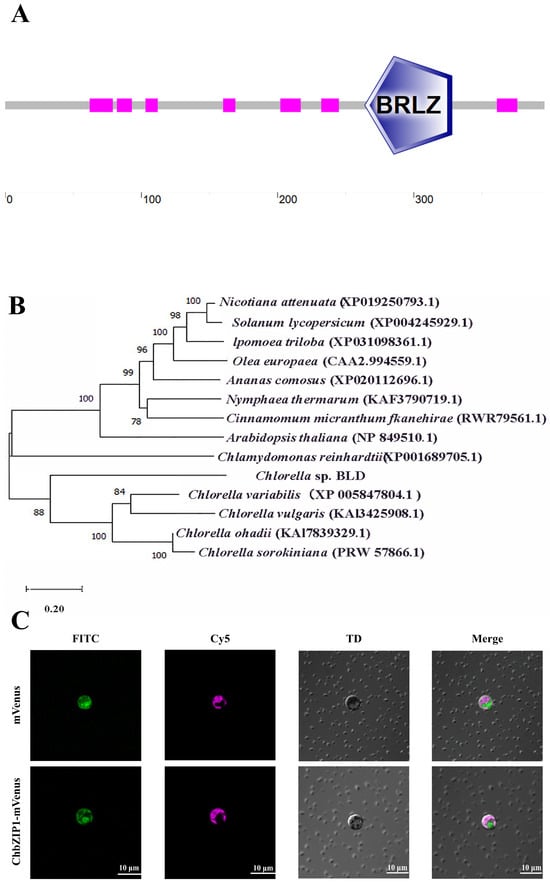 The role of the bZIP transcription factor family in eukaryotes, especially higher plants, has been extensively studied. It has extensive effects on plant abiotic stresses and their regulatory mechanisms [], but there are few reports on bZIP TFs in microalgae []. Therefore, we selected the ChbZIP1 TF of Chlorella sp. BLD, which can tolerate high pH values (pH > 10), as the research object and combined physiological and biochemical analysis, transcriptomics, molecular biological testing, and other methods to explore the possible mechanism of the ChbZIP1. We used sequence alignment and neighbor-joining (NJ) tree analysis to determine that ChbZIP1 belongs to the bZIP TFs family and has a certain homology with bZIP TFs from other microalgae and plants (Figure 1A,B). Then, by expressing the ChbZIP1-mVenus fusion protein in C. reinhardtii, we determined that it localized to the nucleus rather than the cytoplasm (Figure 1C), further demonstrating that it may perform the role of a transcription factor.