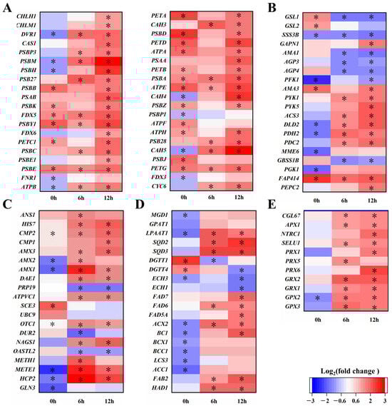 Differential gene expression of the selected metabolic pathways between the ChbZIP1-overexpressed transformant bZIP1-C16 and WT in an alkaline environment (pH = 9). Classified according to the different metabolic pathways involved in differentially expressed genes, divided into photosynthesis (A), carbohydrate metabolism (B), protein and amino acid metabolism (C), lipid metabolism (D), and ROS metabolism (E). Boxes with different color shades represent the multiple differential expression of genes. The right side of the figure is the legend. Significant differences are denoted by asterisks as absolute log2 (fold change) values > 1 and p < 0.05; n = 3.