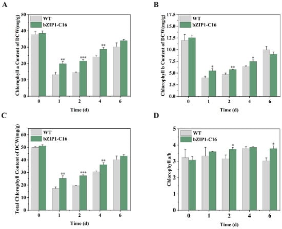 Comparison of the dynamic changes in the chlorophyll content of the ChbZIP1-overexpressed transformant bZIP1-C16 and WT in an alkaline environment (pH = 9). The light absorption value was measured to calculate the chlorophyll a content (A), chlorophyll b content (B), total chlorophyll content (C), and the ratio of chlorophyll a to b (D). They were first grown in a TAG medium at pH 7.0, and then transferred to an AMPSO-acetate phosphate medium (pH = 9.0). The cells were collected on 0, 1, 2, 4, and 6 days of culture, and chlorophyll was extracted with ethanol. Values are mean ± SD, (n = 3). Student’s t-tests were performed to determine statistically significant differences: *, p < 0.05; **, p < 0.01; and ***, p < 0.001.