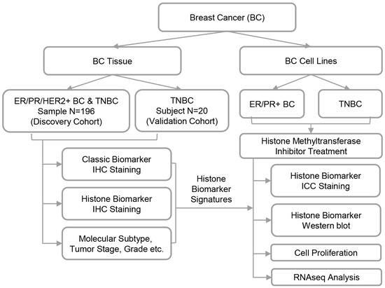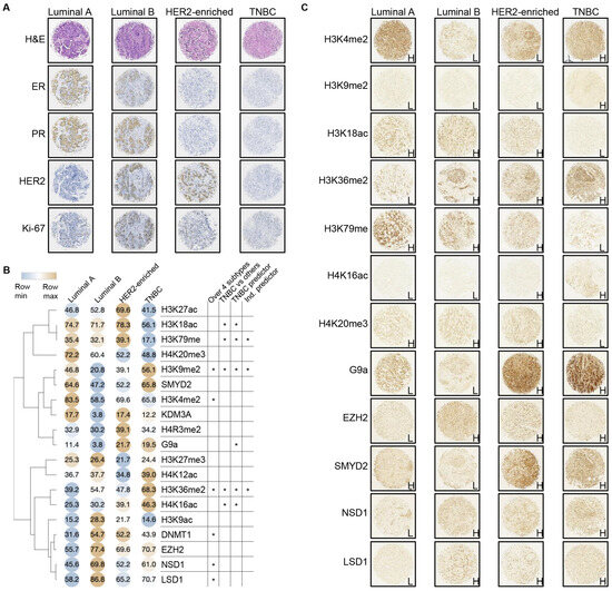 Histone biomarkers strongly associated with molecular types of breast cancer (BC) were identified through immunohistochemical (IHC) staining in tissue and cell line samples. The functional roles of histone biomarker signatures were further investigated using cell line models treated with small molecule inhibitors targeting histone methyltransferases.