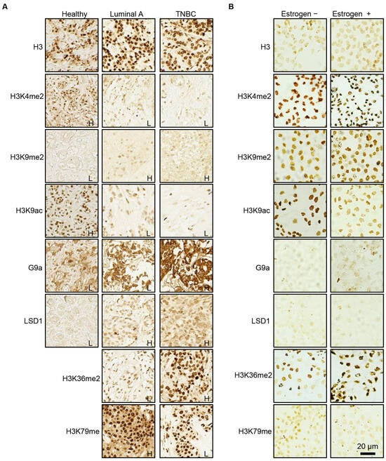 IHC of TNBC-specific histone biomarker signatures in tissue and cell lines. (A) High-power IHC image representatives of TNBC-specific histone biomarker signatures in adjacent healthy breast tissue (Healthy), luminal A breast cancer tissue, and TNBC tissue. (B) Immunocytochemical (ICC) staining image representatives of TNBC-specific histone biomarker signatures in luminal A cell lines (MCF-7) without or with estrogen treatment. Staining results are annotated as H or L (high or low IHC scores).