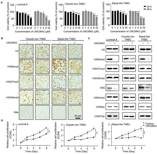 UNC0642, a novel small-molecule inhibitor targeting the catalytic activity of G9a, was evaluated in MCF-7 (luminal A), MDA-MB-231 (claudin-low TNBC), and MDA-MB-468 (basal-like TNBC) cell lines. Cell viability assays were performed to optimize the dose and treatment duration (Figure 6A). Finally, non-cytotoxic concentrations of UNC0642 (2 µM) were applied in all subsequent experiments. This inhibitor demonstrated significant efficacy in reducing H3K9me2 levels in all three cell lines, as confirmed by both pathological staining and Western blotting analysis (Figure 6B,C). Other histone modifications, such as H3K4me2, or alternative modifications at the same residue, such as H3K9ac, remained unaffected, indicating the high specificity of UNC0642. Interestingly, G9a protein levels were also reduced in basal-like TNBC cells, which exhibited a more pronounced decrease in H3K9me2 compared to claudin-low TNBC cells. UNC0642 treatment resulted in marked growth inhibition across all tested cell lines, with the most significant effects observed in basal-like TNBC cells, followed by claudin-low TNBC cells, and moderate effects in luminal A cells (Figure 6D).