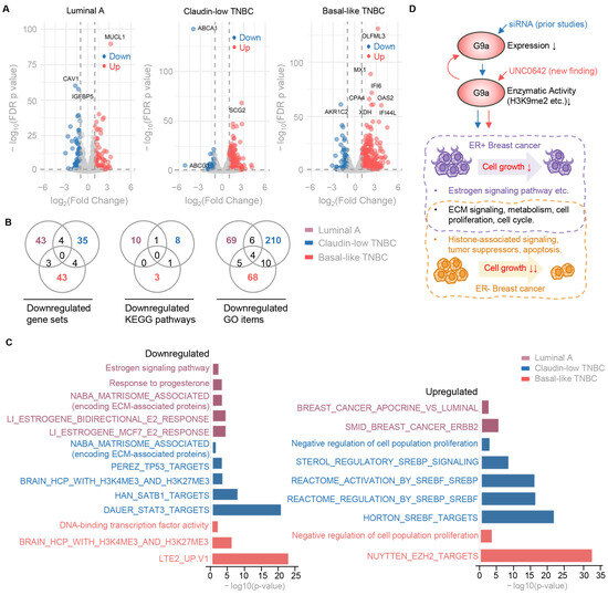 Transcriptomic analysis of BC cell lines treated with G9a inhibition. (A) Volcano plots showing differentially expressed genes (DEGs) in each cell line after inhibitor treatment, with up-regulated and down-regulated genes annotated by color. The x-axis represents log2 fold change, and the y-axis indicates −log10 FDR p-value. (B) Venn diagrams illustrating the overlap of significantly downregulated gene sets, Kyoto Encyclopedia of Genes (KEGG) pathways, and gene ontology (GO) items among the three cell lines, highlighting shared and cell-line-specific pathways affected by the inhibitor. (C) Bar plots of representative enriched KEGG pathways, GO items, and gene sets either down-regulated or up-regulated in BC cell lines as indicated. The x-axis represents the −log10 FDR p-value. (D) A working model illustrates the effects of G9a knockdown and inhibition in breast cancer cell lines, integrating findings from prior studies (blue arrows) and the current work (red arrows). Both siRNA-mediated knockdown and small-molecule inhibitor-mediated inhibition demonstrate how reducing G9a activity impairs cell growth in ER-positive (annotated in purple) and ER-negative (annotated in orange) breast cancer cell lines.