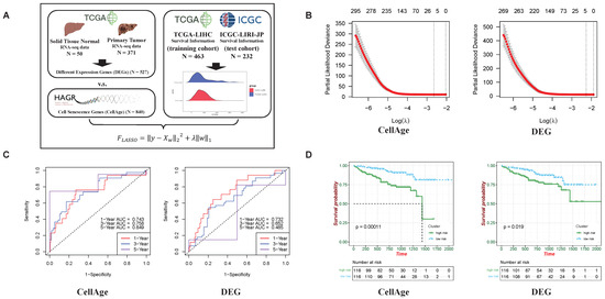 The CellAge gene set predicts the survival of patients with hepatocellular carcinoma (HCC) better than differential expression genes (DEGs). (A) We used 463 patient survival information records from the TCGA-LIHC cohort as the training dataset and 232 patient survival information records from the ICGC-LIHC-JP cohort as the testing dataset to evaluate the predictive ability of the CellAge gene set and DEGs for survival using the least absolute shrinkage and selection operator (LASSO) algorithm and Cox regression. DEGs: differential expression analysis between “Solid Tissue Normal” (N = 50) and “Primary Tumor” (N = 371) from TCGA-LIHC; CellAge: obtained from the Human Ageing Genomic Resources (HAGR, https://genomics.senescence.info/, accessed on 13 January 2025). (B) Partial likelihood deviance of CellAge and DEGs in the ICGC-LIHC-JP cohort. (C) receiver operating characteristic (ROC) analysis of CellAge and DEGs in the ICGC-LIHC-JP cohort. (D) Prognosis of high and low risk based on CellAge and DEGs in the ICGC-LIHC-JP cohort.
