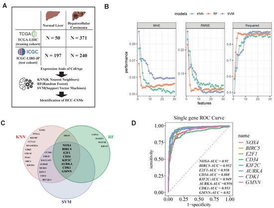 To discern key feature genes distinguishing HCC from normal tissue, we employed three machine learning algorithms, namely KNN, RF, and SVM by the R packages “e1071” (1.7.14), “kernlab” (0.9.32), and “caret” (6.0.94), alongside a feature selection algorithm [93,94,95]. Variable selection was carried out using 10-fold cross-validation, and the models were assessed using MSE, RMSE, and Rsquared. The common feature genes identified by the three machine learning algorithms were termed HCC-CSMs. Subsequently, we computed the AUC values for the selected feature genes using the ICGC-LIRI-JP (N = 437) and GSE214846 (N = 130) datasets to evaluate their classification performance.