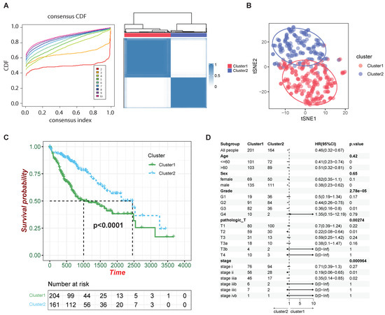 We have shown that HCC-CSMs can effectively distinguish normal liver tissue from HCC. However, we also want to determine whether HCC-CSMs can reflect the severity of HCC. To further explore the expression patterns of HCC-CSMs within HCC patients, we attempted to group the HCC patients from the TCGA-LIHC dataset, referring to the expression levels of eight HCC-CSMs. Therefore, we performed consensus clustering analysis using the expression data of HCC-CSM genes sourced from TCGA-LIHC. Determining the optimal number of clusters (k) involved analyzing the consensus cumulative distribution function (CDF). Our observation revealed that the CDF stabilized at k = 2, suggesting that two clusters were the most suitable representation (Figure 3A). Meanwhile, when utilizing t-distributed stochastic neighbor embedding (t-SNE) for dimensionality reduction and visualization of patients with the expression levels of HCC-CSMs, we observed a clear delineation into two clusters as well (Figure 3B).