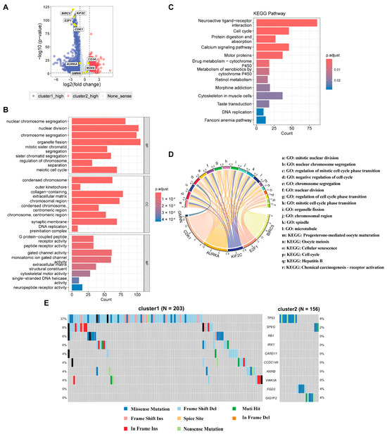 Differentially expressed genes and enrichment analysis. (A) Volcano plot showing differentially expressed genes between cluster 1 and cluster 2. (B) GO enrichment analysis. (C) KEGG enrichment analysis. (D) Correspondence between HCC-CSMs and enriched pathways. (E) Somatic mutation analysis of cluster 1 and cluster 2.