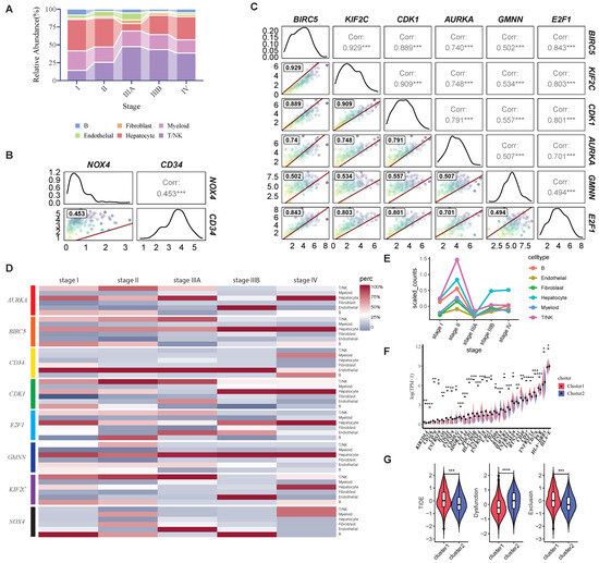 Single-cell gene expression visualization and immune checkpoints, TIDE analysis. (A) The proportion of each cell type at different stages in the progression of HCC. (B) Correlation between expression levels of NOX4 and CD34. (C) Correlation among expression levels of the six genes, BIRC5, KIF2C, CDK1, AURKA, GMNN, and E2F1. (D) The proportion of cells expressing HCC-CSMs in different types of cells as the stage changes. (E) The average expression of the BIRC5 gene in different cell types. (F) Expression levels of immune checkpoint molecules across different clusters in transcriptome data. (G) TIDE scores, dysfunction scores, and exclusion scores across different clusters in transcriptome data. Statistical significance was indicated as * p < 0.05, ** p < 0.01, and *** p < 0.001.