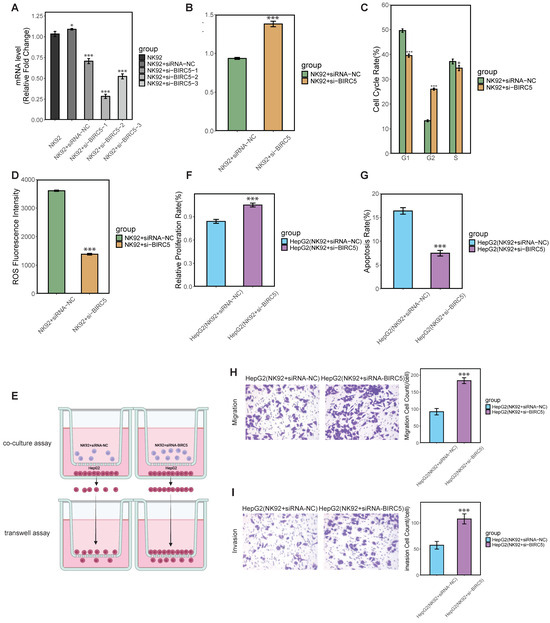 In vitro experiments validate the function of BIRC5 in NK92 cells. (A) NK92 cells were transfected with siRNA targeting BIRC5, and cells were collected 48 h later to evaluate BIRC5 knockdown efficiency by quantitative polymerase chain reaction (qPCR). (B) NK92 cells transfected with si-BIRC5 were subjected to CCK-8 assay. (C,D) The cell cycle and reactive oxygen species (ROS) of NK92 cells transfected with si-BIRC5 were detected by flow cytometry. (E) Transwell schematic diagram. (F,G) After NK92 cells transfected with si-BIRC5 were co-cultured with HepG2 cells, CCK-8 cell activity and apoptosis assays were performed on HepG2 cells. (H,I) Transwell assay for migration and invasion of HepG2 cells co-cultured with NK92 + siRNA-NC, NK92+si-BIRC5. Data are presented as mean ± SD. Statistical significance was indicated as * p < 0.05, and *** p < 0.001.