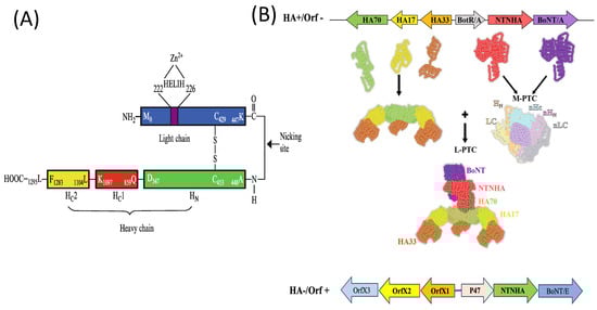 As previously mentioned, two distinct types of botulinum toxin (BoNT) complexes exist: HA-positive (HA+) and OrfX-positive (OrfX+) BoNT complexes. Among the Clostridium botulinum serotypes, only Type A produces three different forms of BoNT complexes: the M complex (12S; ~300 kDa), the L complex (16S; ~500–600 kDa), and the LL complex (large/large; a dimer of two 16S complexes forming a 19S complex; ~900 kDa) (Figure 1) [3,7]. Other C. botulinum serotypes typically produce either the M (12S) or L (16S) complexes. The size of isolated botulinum toxin is approximately 150 kDa, consisting of two primary domains: the heavy chain (HC; ~100 kDa) and the light chain (LC; ~50 kDa) (Figure 1A). The heavy chain is further divided into three subdomains: Hc1 (or HCN domain; ~25 kDa), Hc2 (or HCC domain; ~25 kDa), and HN (the N-terminal domain; ~50 kDa) (Figure 2A). In the HA+ botulinum toxin complexes, the components include BoNT itself, NTNHA (Non-toxin Non-hemagglutinin Activity, which serves as the neurotoxin-binding protein), and hemagglutinin proteins (HA70, HA17, HA33). Together, these proteins are referred to as neurotoxin-associated proteins (NAPs) [7]. The ratio of these components varies across different studies, such as 1:1:2:2:3 [8], 1:1:3-5:5-6:8-9 [9], or 1:1:3:3:3 [10], with some studies specifically investigating BoNT/A L complexes [11]. In structural analyses, such as those based on crystal and cryomicrographic data (PDB IDs: 3V0B and 3WIN), the BoNT/A and BoNT/B complexes exhibit a triskelion-like structure (Figure 2B), where BoNT/A directly binds to NTNHA. NTNHA is further associated with three flexible appendages formed by the HA proteins (HA70, HA17, HA33). Notably, analysis by [9] identified additional HA proteins in the BoNT/A complex—HA48 and HA23—which are the result of HA70 cleavage.