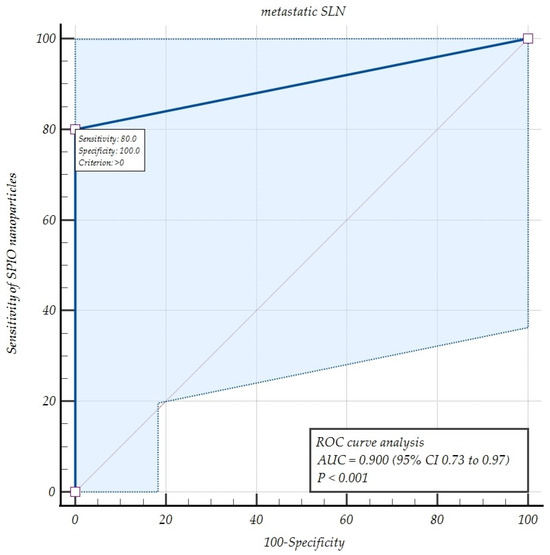 The diagnostic accuracy parameters of the SPIO detection of metastatic SLNs evaluated by Receiver Operating Characteristic (ROC) curve analysis with the area under the ROC curve (AUC) demonstrated a sensitivity of 80% and AUC of 0.9 (p <0.001), confirming the SPIO technique’s efficacy in women with EC (Figure 1).