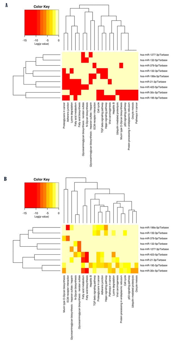 (A,B) Functional enrichment analysis of study ASD-miRNAs. (A) Targeted pathway clusters/heatmap illustrating results based on the existence (red) or absence (yellow) of statistical significance. (B) Significance clusters/heatmap illustrating results based on the effect sizes of statistical significance by using the exact significance levels of calculated p-values, represented with a gradient color (see legend). MiRNAs/KEGG pathway heatmaps were based on pathway union method to merge results and constructed by DIANA-mirPath v.3 web server. Dendrograms were designed using a complete linkage method with Euclidean distance measure and FDR corrected p-values were calculated by using Fisher’s exact test.
