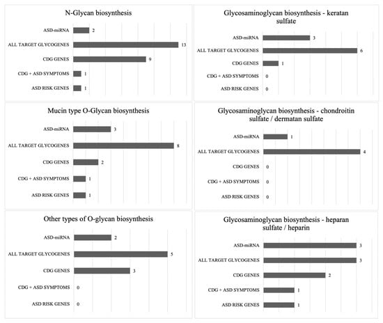 We computed the number of involved ASD-miRNAs identified for each glycosylation pathway and herein highlighted their molecular targets (glycogenes). Next, we considered if targeted glycogenes included OMIM-classified genes associated with CDGs []. Moreover, we evaluated whether targets of ASD-miRNAs in the glycosylation pathways were enriched for ASD risk genes reported in the Simons Foundation Autism Research Initiative and AutDB database (http://autism.mindspec.org/autdb/HG_Home.do (accessed on 21 June 2024)) including genes reported by GWAS studies, common variant association, genetic syndromes, and copy number variation [].