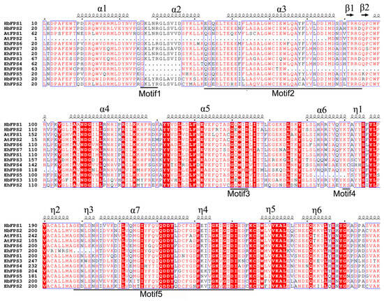 | EhFPS5 | 323 | 37.44 | 5.14 | −0.293 | 65.94 | 2.48 | 7.74 | 23.84 | Cytoplasm |