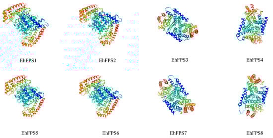 | EhFPS7 | 336 | 38.97 | 6.52 | −0.317 | 63.99 | 2.98 | 7.14 | 25.89 | Cytoplasm |